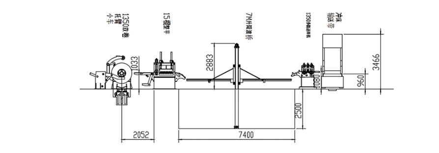 液壓上料小車→開卷機→接料鏟頭→整平主機→渡橋→NC偏擺定尺送料機→沖壓設備→圓片輸送帶(液壓系統(tǒng)、氣動系統(tǒng)、電控系統(tǒng))