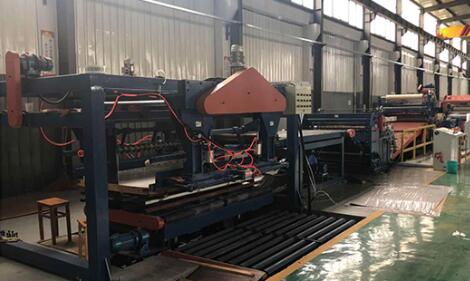 設(shè)備在工作時(shí)開卷機(jī)處于送料狀態(tài),板料進(jìn)入整平機(jī)校平后,再經(jīng)電眼控制活套、側(cè)向機(jī)構(gòu)進(jìn)入NC定尺裝置,NC定尺裝置按設(shè)定好的尺寸定尺向后工序剪床送料;當(dāng)NC送料達(dá)到設(shè)定尺寸時(shí),設(shè)備停止送料同時(shí)將信號(hào)傳給剪床,由剪床將板料切斷,切下的板料經(jīng)輸送裝置送入集料架整齊堆垛,堆垛鋼板的升降臺(tái)可隨堆垛鋼板高度的增加而自動(dòng)下降;當(dāng)堆垛鋼板張數(shù)達(dá)觸摸屏設(shè)定值時(shí),生產(chǎn)線自動(dòng)停機(jī),此時(shí)人工控制降下升降臺(tái),將出料臺(tái)車開出,同時(shí)開進(jìn)另一臺(tái)出料臺(tái)車,即進(jìn)入下一工作循環(huán)。