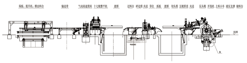 本設(shè)備的工作流程:本設(shè)備是將鋼板(各種金屬材料卷)通過(guò)整平后、定尺橫剪的方式把鋼板加工成客戶需要尺寸的專用剪切設(shè)備。該生產(chǎn)線的主要設(shè)備由收紙機(jī)、液壓上料小車、開卷機(jī)、接料鏟頭、整平主機(jī)、渡橋、NC定尺送料機(jī)、靜電覆紙機(jī)構(gòu)、高速剪床、集料等機(jī)構(gòu)構(gòu)成,中間輔以運(yùn)料、緩沖、引導(dǎo)、輸送、出料等裝置。